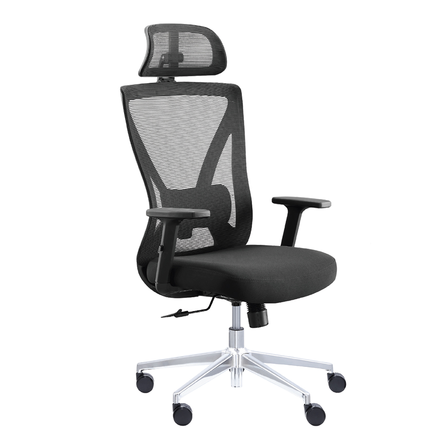 obrotowy fotel biurowy z ergonomicznym oparciem z elastycznej siatki miękkie, wypełnione pianką siedzisko mechanizm motylkowy (TILT) dający możliwość swobodnego kołysania oraz blokady pozycji do pracy zintegrowany zagłówek stałe podparcie lędźwiowego odcinka kręgosłupa podłokietniki PU zapewniająca stabilność pięcioramienna, stalowa, chromowana podstawa podnośnik gazowy (siłownik): 100 mm kółka nylonowe, twarde, do wszystkich typów podłóg - średnica 50 mm materiał: siatka poliestrowa wysokość krzesła: 100 - 110 cm regulacja wysokości siedziska w zakresie: 46 - 58 cm szerokość oparcia: 45cm wysokość oparcia: 58 cm szerokość siedziska: 50 cm głębokość siedziska: 46 cm średnica podstawy: 64 cm maksymalne obciążenie: 110 kg rekomendowany czas siedzenia: do 6 godzin dziennie gwarancja: 2 lata kolor: czarny