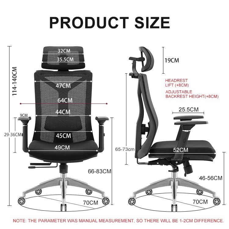 - zagłówek 3D, tapicerowany siatką z możliwością regulacji: przód-tył, góra-dół i kąt nachylenia